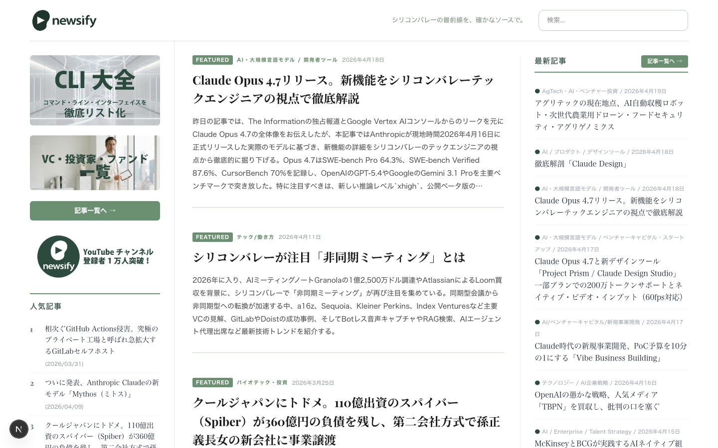 newsify.tv は、シリコンバレーの投資家視点でAI業界の動きを追うニュースメディアです。Anthropic、OpenAI、Google DeepMind、そして台頭するAIスタートアップまで、公式発表・一次情報を起点に、発表から24時間以内を目安に記事化しています。数字・プロダクト・資金調達といった事実を、VCが市場をどう評価するかという視点で整理してお届けします。